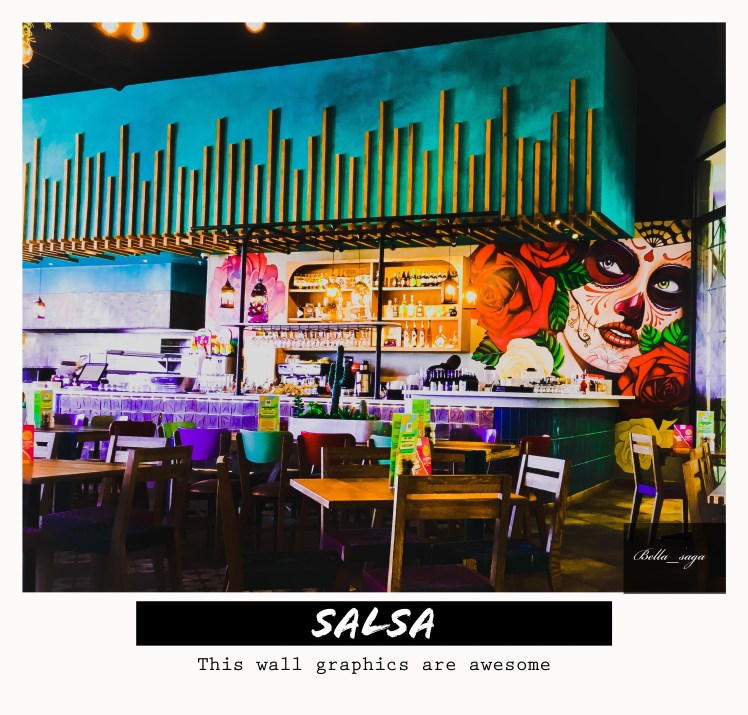 Salsa Mexican Grill is a restaurant that recently opened in the Nedbank Northridge Mall. They first caught my attention when I walked by and saw their decor. On the one wall, they painted this bright-coloured masterpiece and, out of the sealing hang lights that came out of faux wooden flower boxes, and the wooden beams above the bar made my heart skip a beat. Although the plants were fake, it still captured my attention enough to add this restaurant on my want-to -try- list.