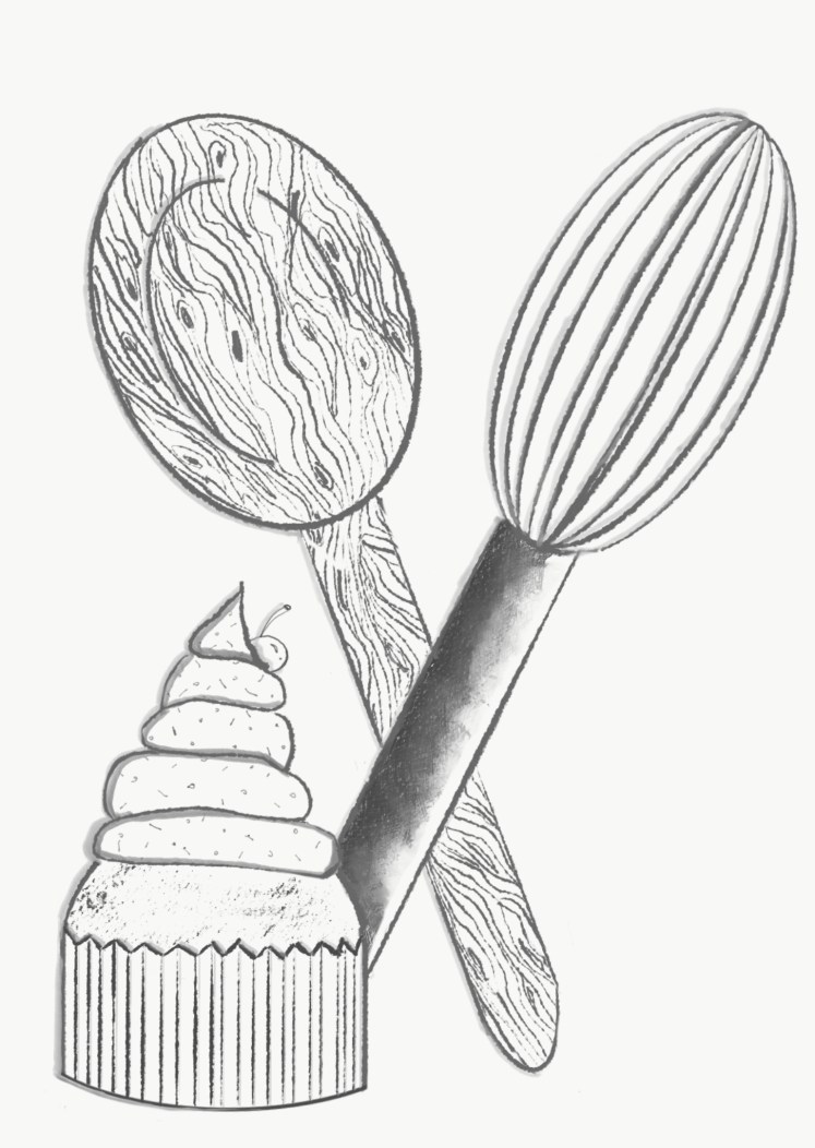 But I changed my mind and decided to draw a wooden spoon, a spatula and a cupcake. The reason for this is I adore baking. It is like a safe haven for me. A place to express myself and dream. Baking and even cooking transport me to another world.
