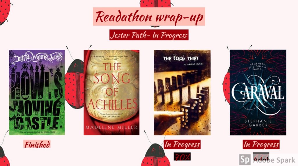 During the fourth week of this readathon, I started to read The Book Thief by Markus Zusak for the third prompt, βread a book which features a bookβ on the Jester path. I did not finish this book for this readathon, but I plan to finish it this month.